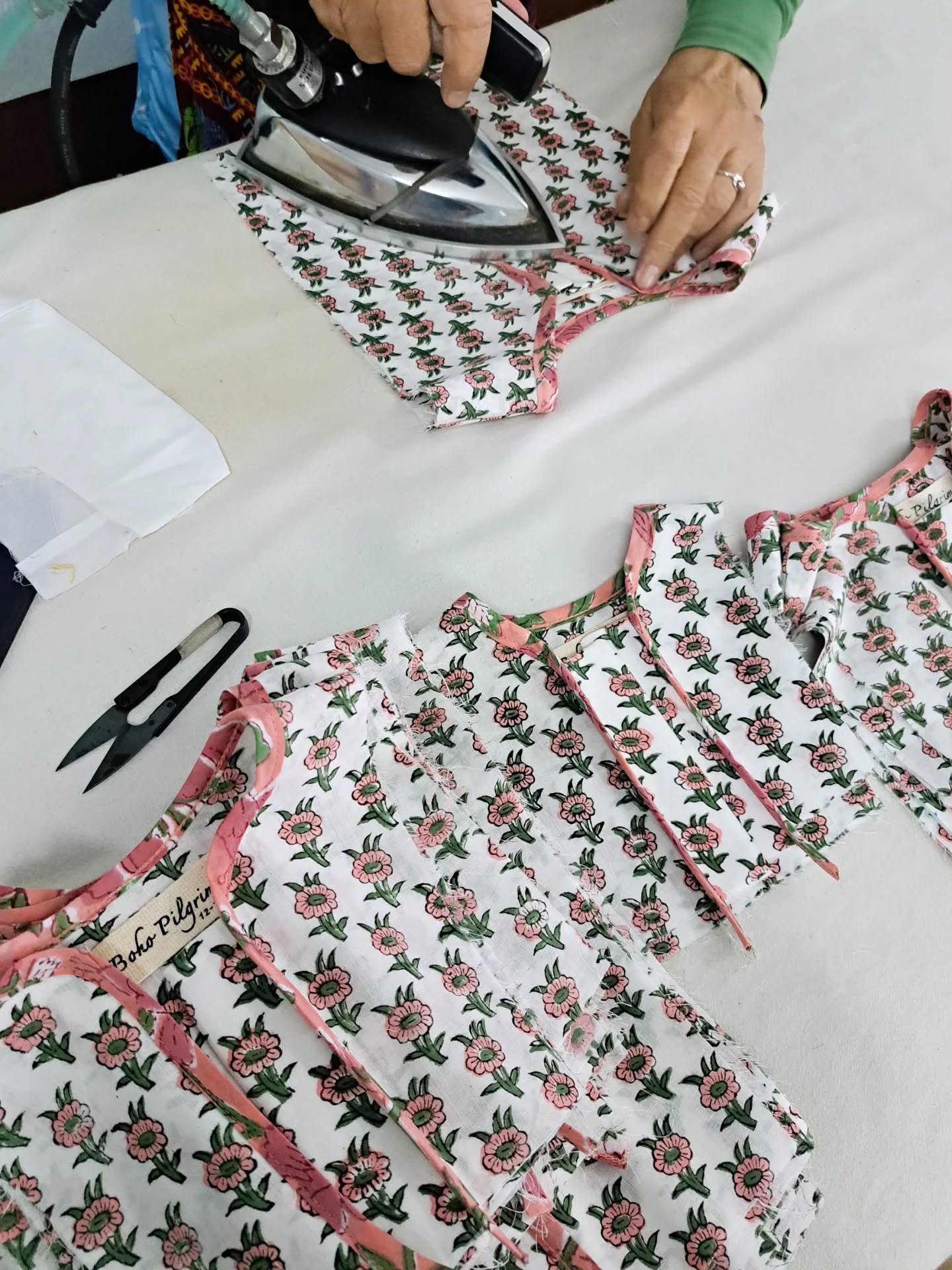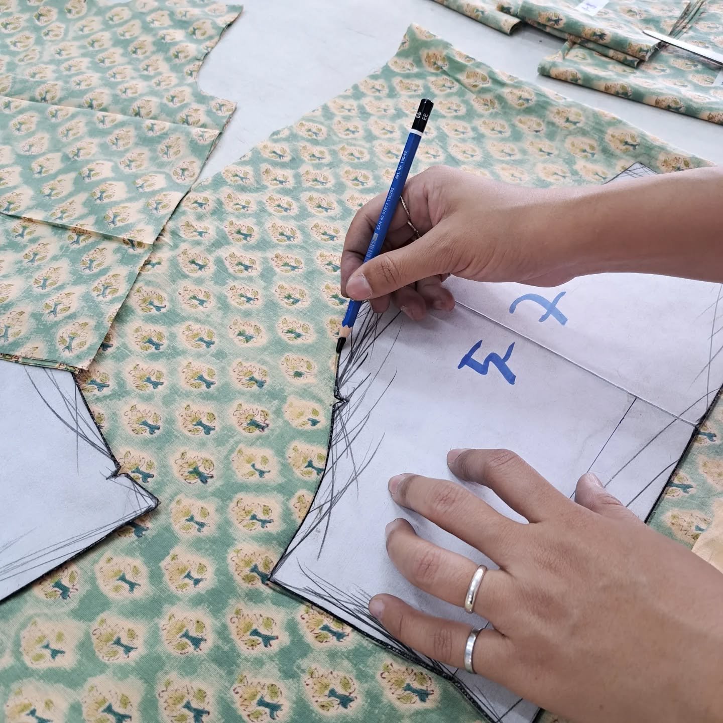 The second floor is for cutting fabric and preparing patterns/designs and finishing products.