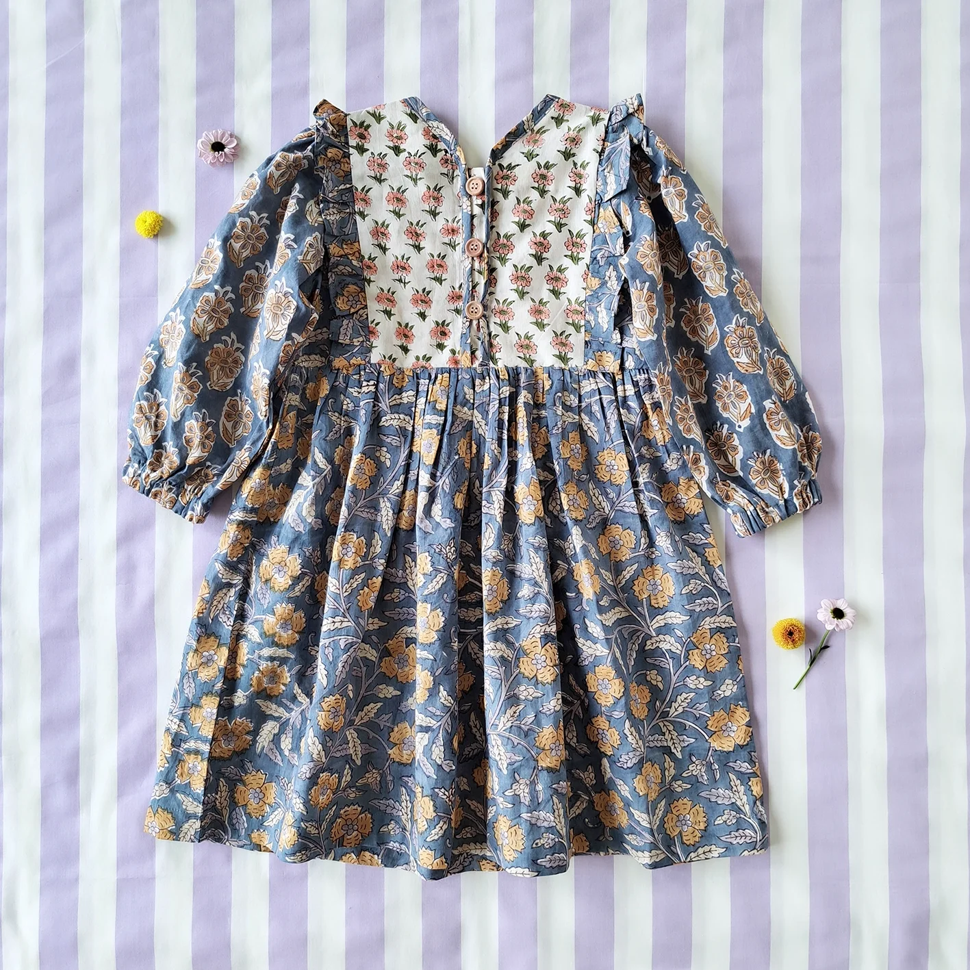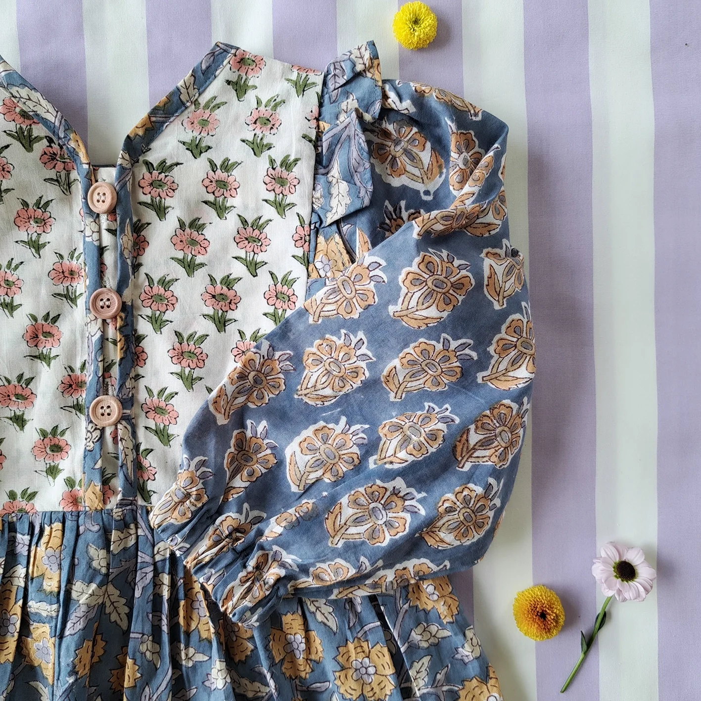 *LIMITED FABRICS -BUTTONS BACK TO FRONT CRAFTED BOHO LONGSLEEVES BLUE DRESS 100% COTTON INDIA HAND BLOCK PRINTED