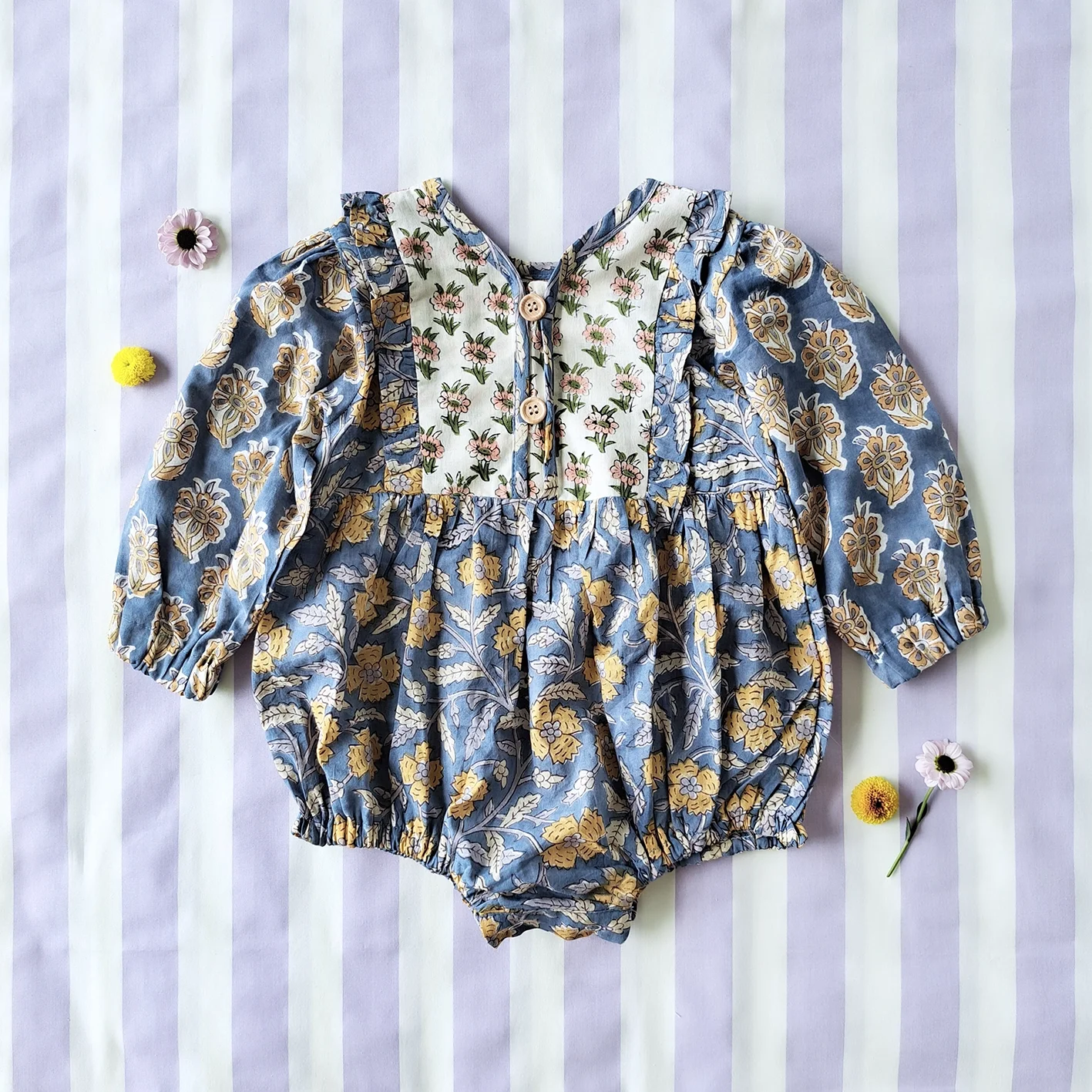 *LIMITED FABRICS -BUTTONS BACK TO FRONT CRAFTED BOHO LONGSLEEVES BLUE ROMPER 100% COTTON INDIA HAND BLOCK PRINTED