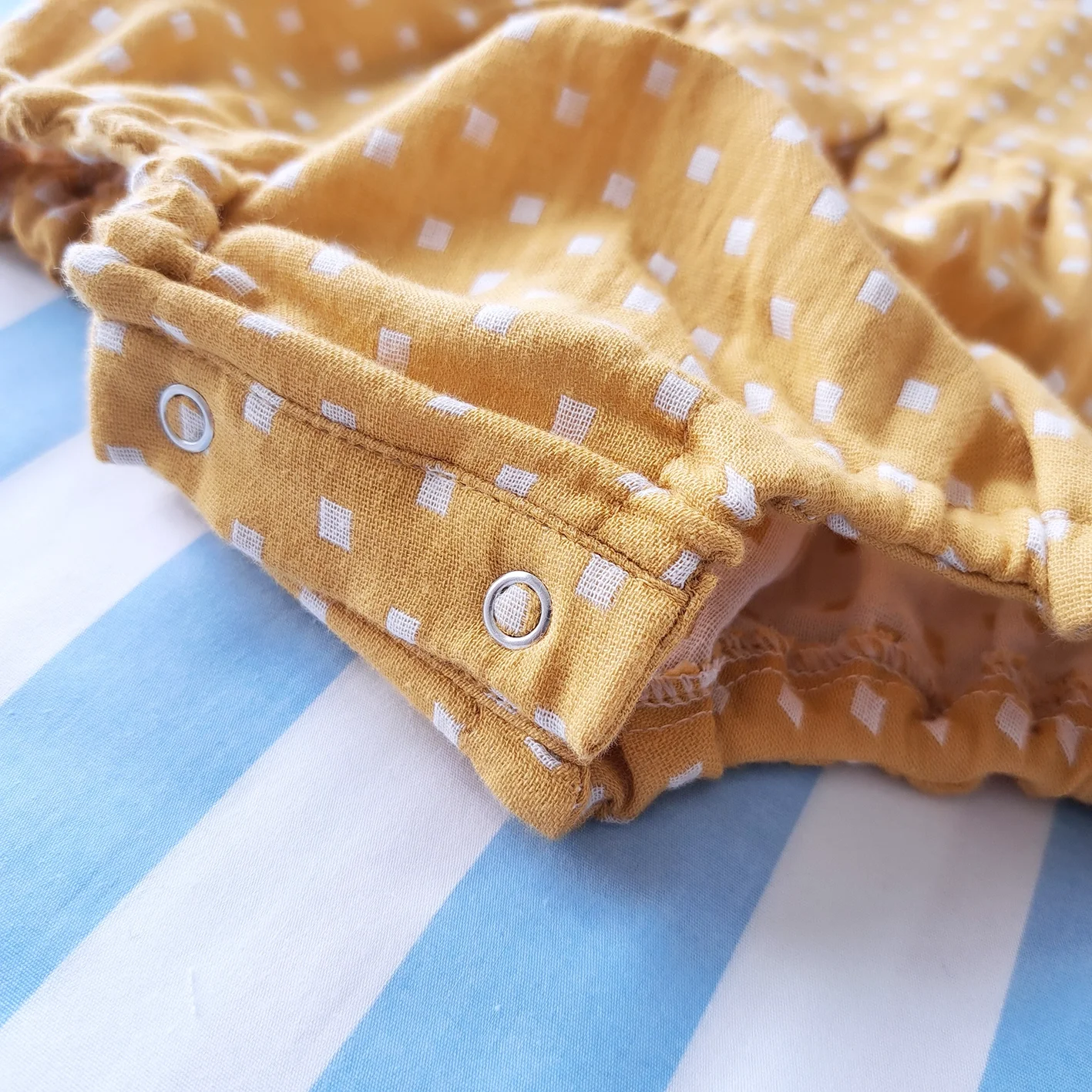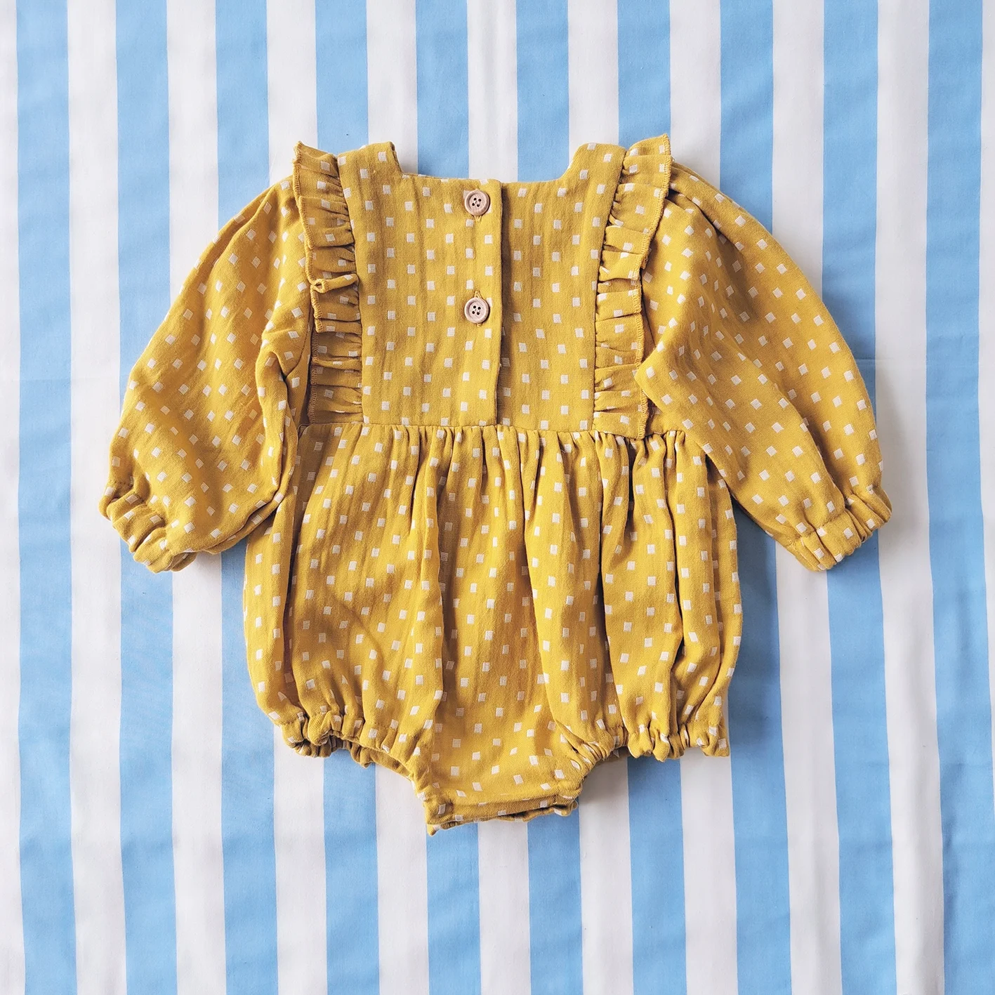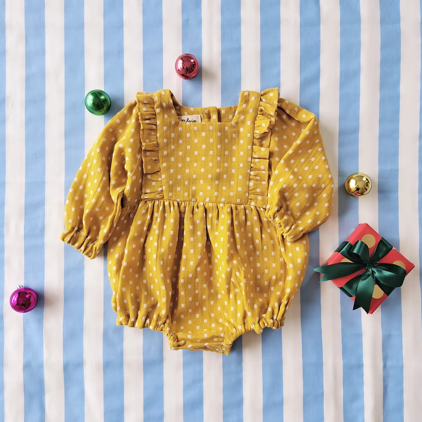 BUTTONS BACK LONG SLEEVE ROMPER 100% COTTON SOFT DOUBLE LAYER YELLOW MUSTARD DOT*PRE-ORDER SHIP OUT 24 NOVEMBER