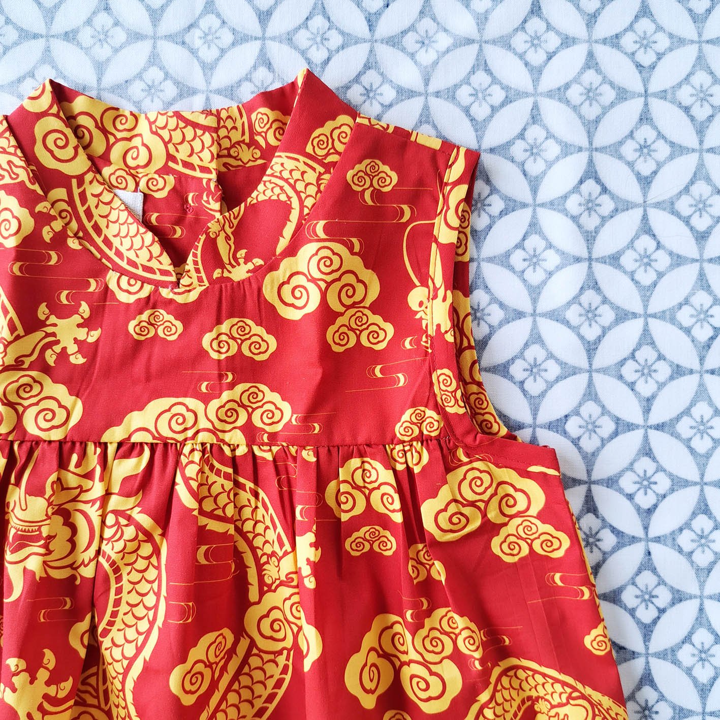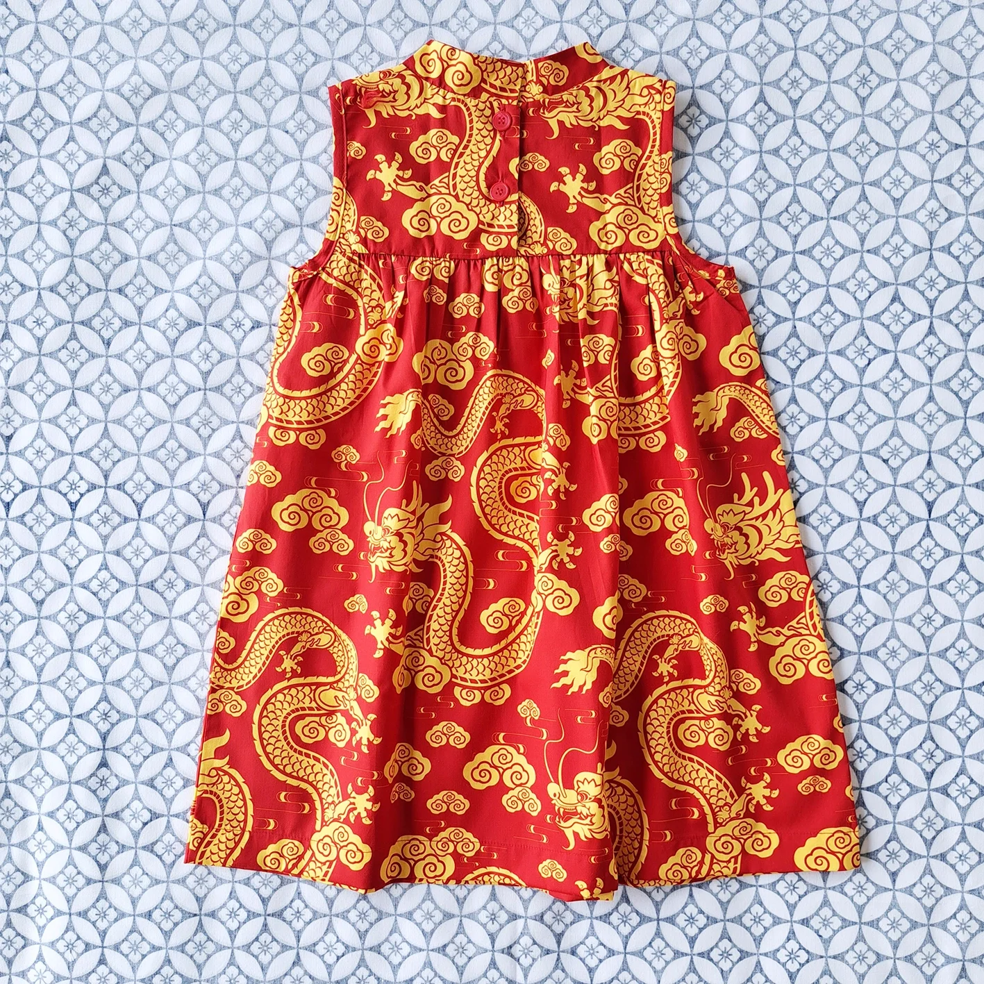 MANDARIN COLLAR BUTTONS BACK SLEEVELESS DRESS 100% PRINTED COTTON RED DRAGON