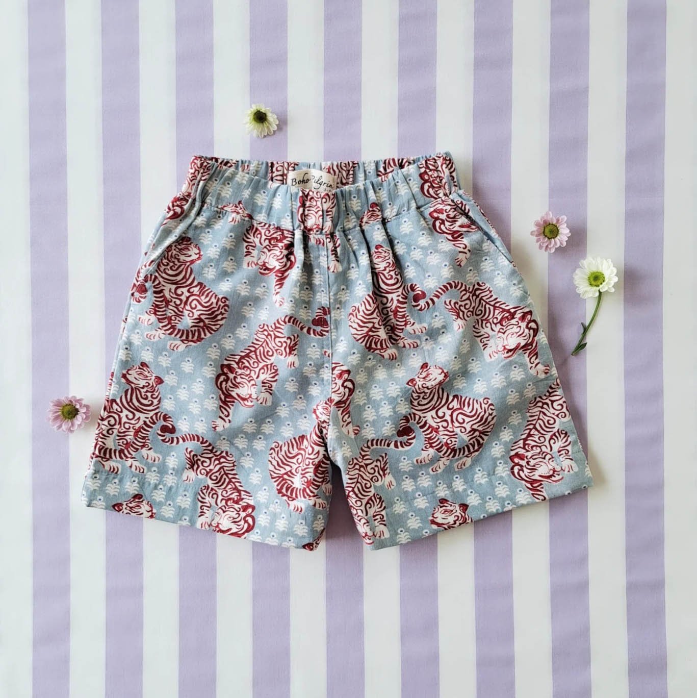 BOYS & GIRLS ELASTIC WAISTBAND SHORTS / 100% COTTON INDIAN HAND BLOCK PRINTED BENGAL TIGER BLUE GREY*予約注文は3月13日に発送されます * PRE-ORDER SHIP OUT 13 MARCH