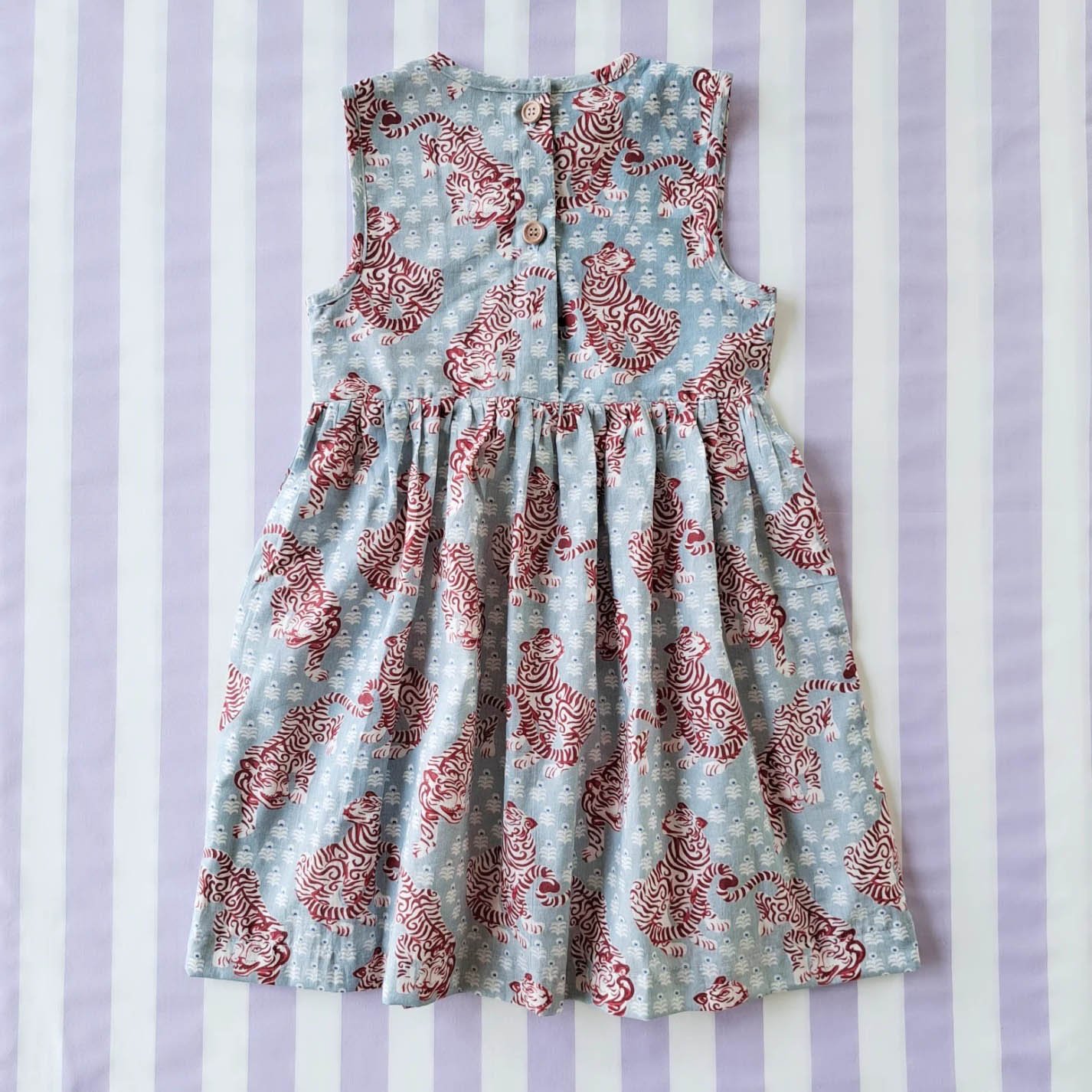 BUTTONS BACK DRESS 100% COTTON INDIAN HAND BLOCK PRINTED BENGAL TIGER BLUE GREY*予約注文は3月13日に発送されます * PRE-ORDER SHIP OUT 13 MARCH