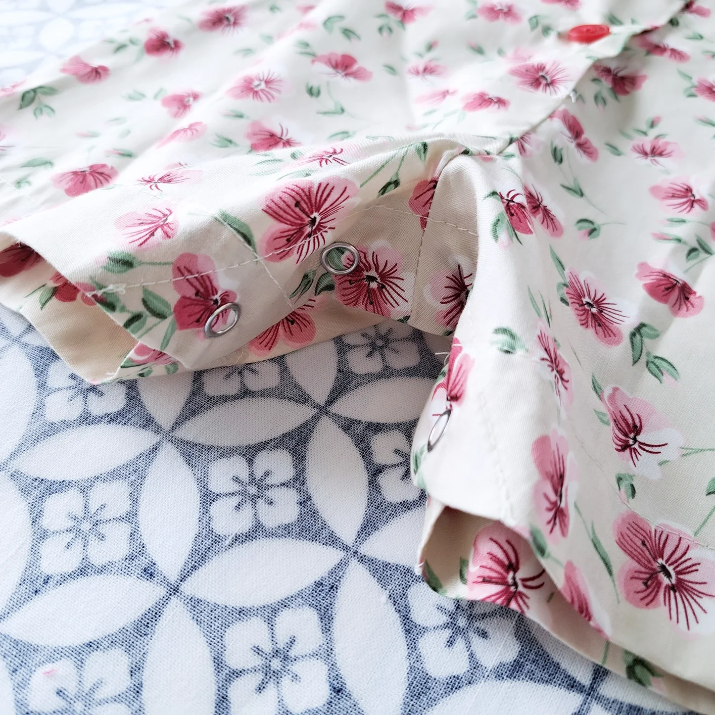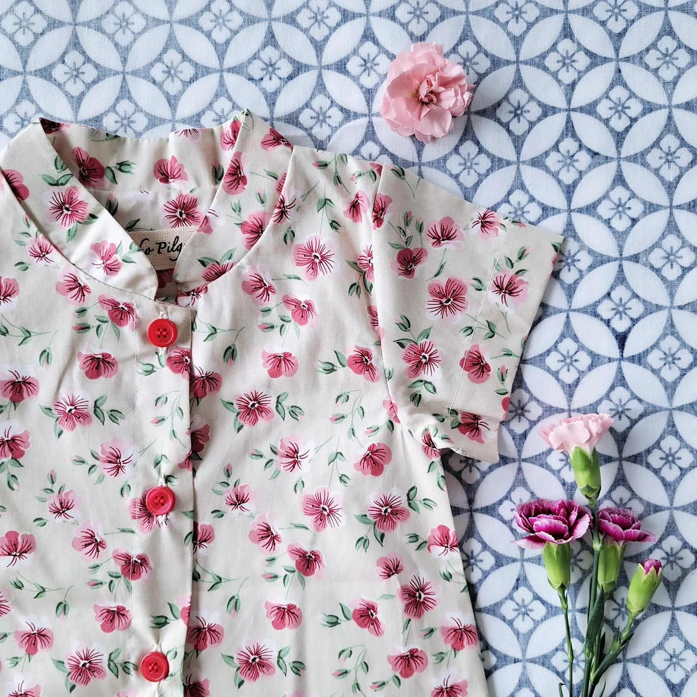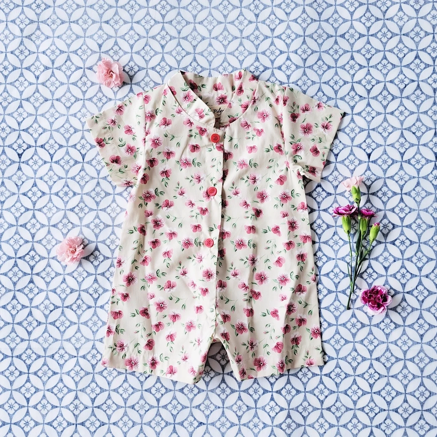 ชุดรอมเปอร์คอจีน กระดุมหน้า ใส่ได้ทั้งชายหญิง เปิดเป้าเปลี่ยนผ้าออ้อมได้ 100 % คอตตอนพิมพ์ลายดอกท้อสีครีม *สินค้าสั่งจองล่วงหน้า ส่งสินค้าออก 7 ธันวาคม