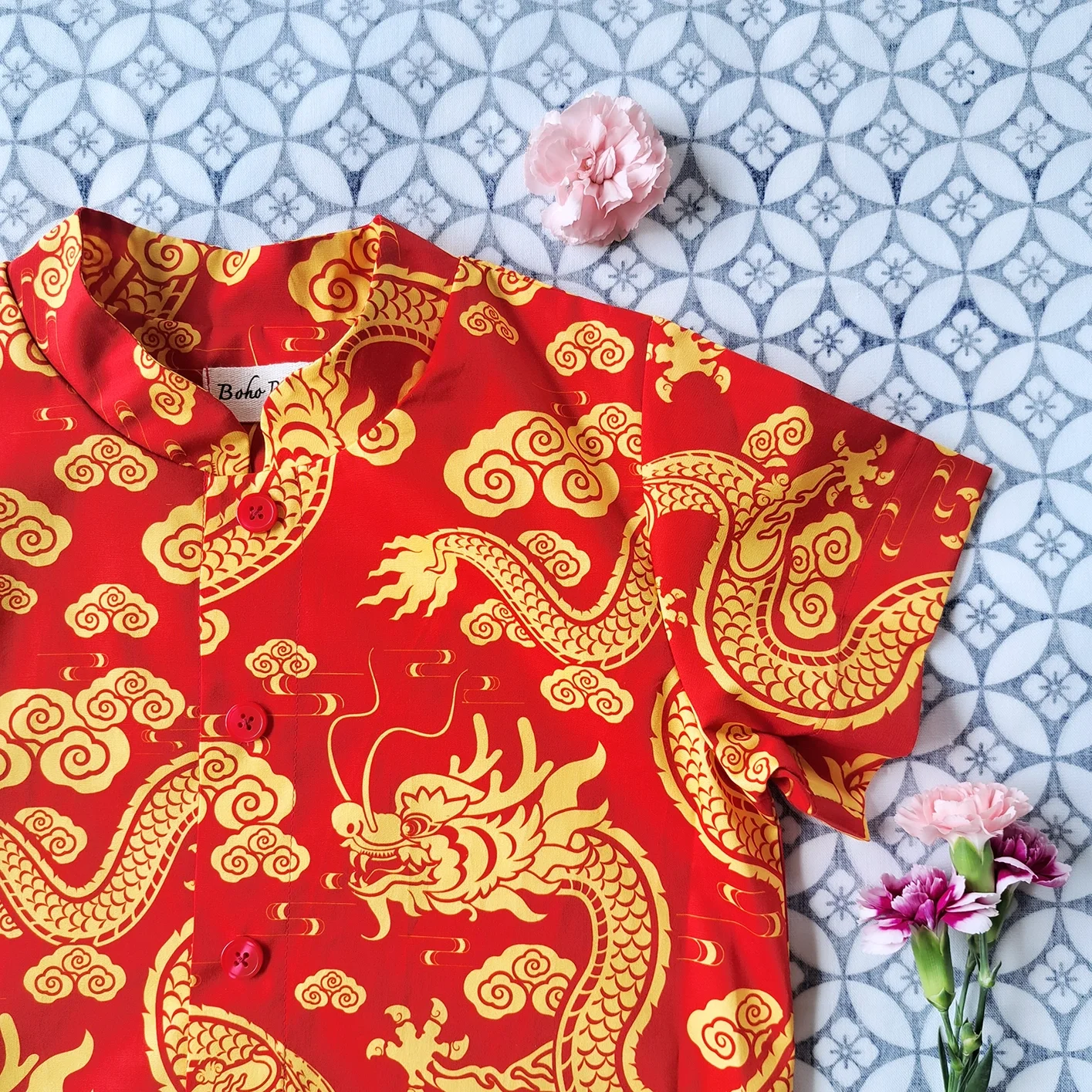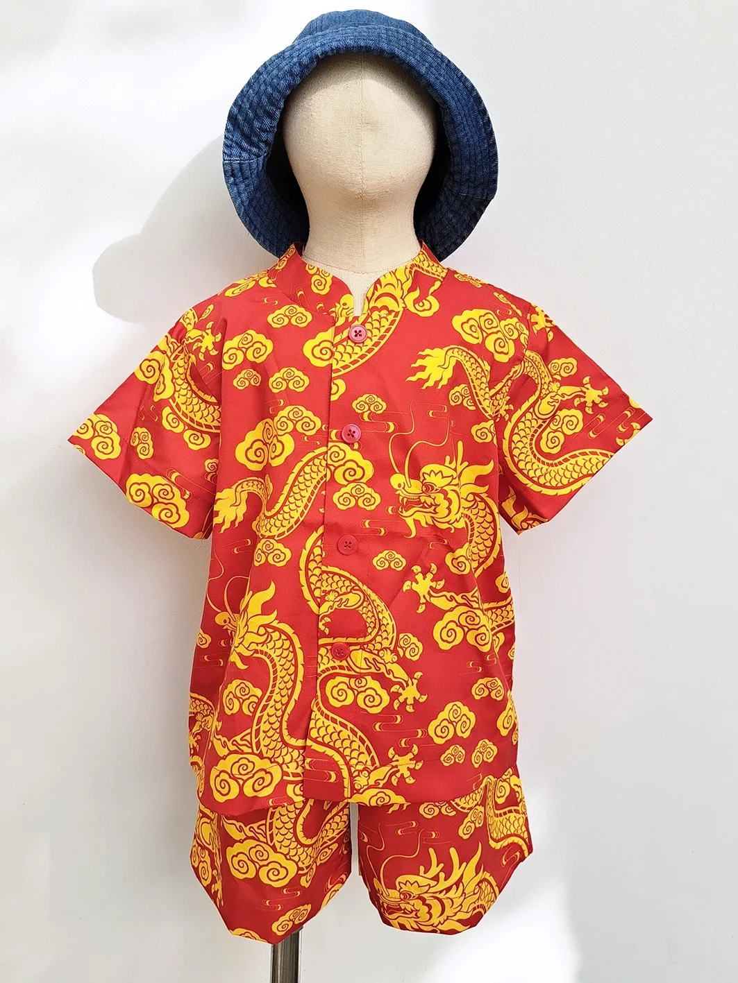 เด็กชาย-หญิง เสื้อเชิ๊ตคอจีน 100% คอตตอน ผ้าพิมพ์ลายมังกร สีแดง *สั่งจองล่วงหน้า ส่งสินค้าออกทางไปรษณีย์ 16 พฤศจิกายน