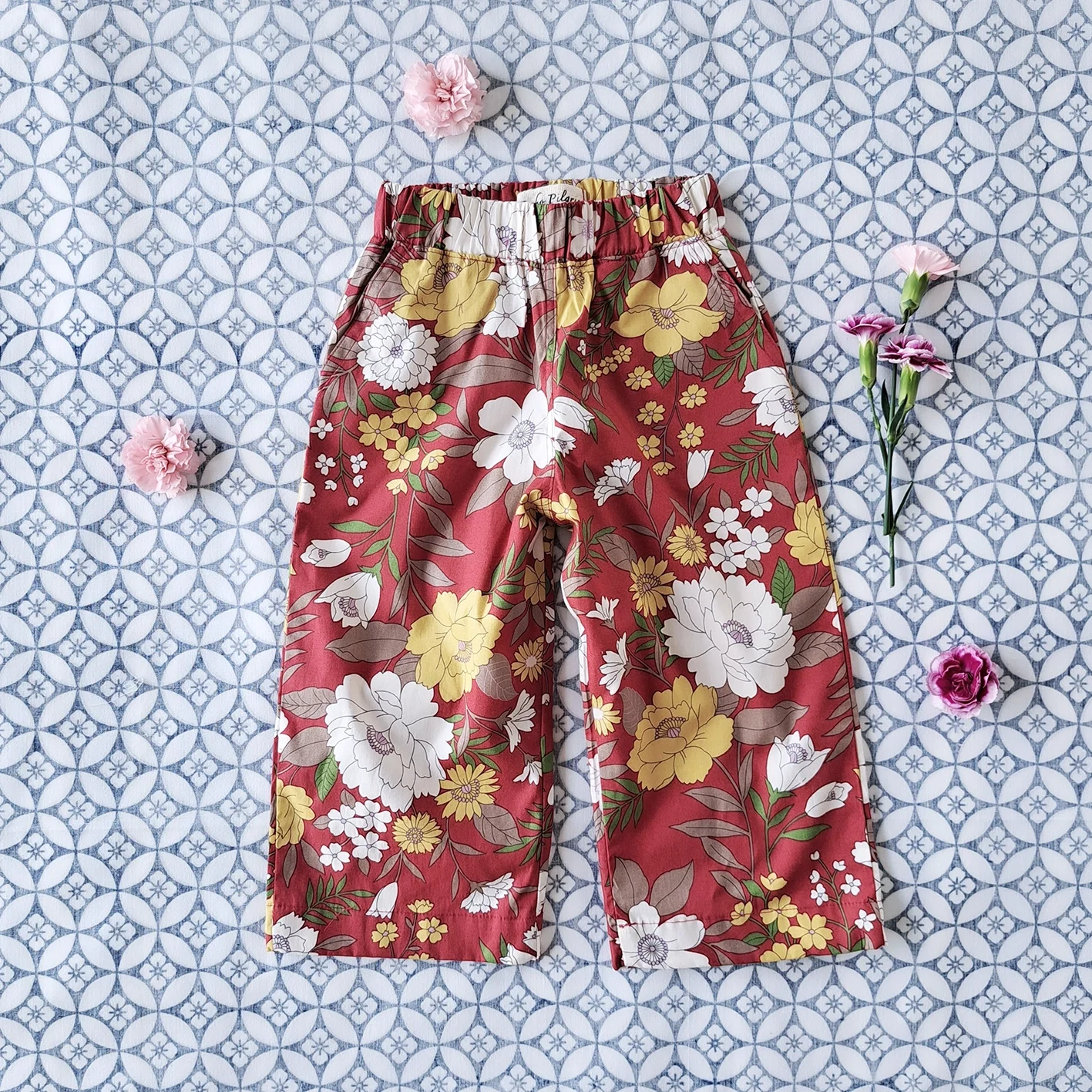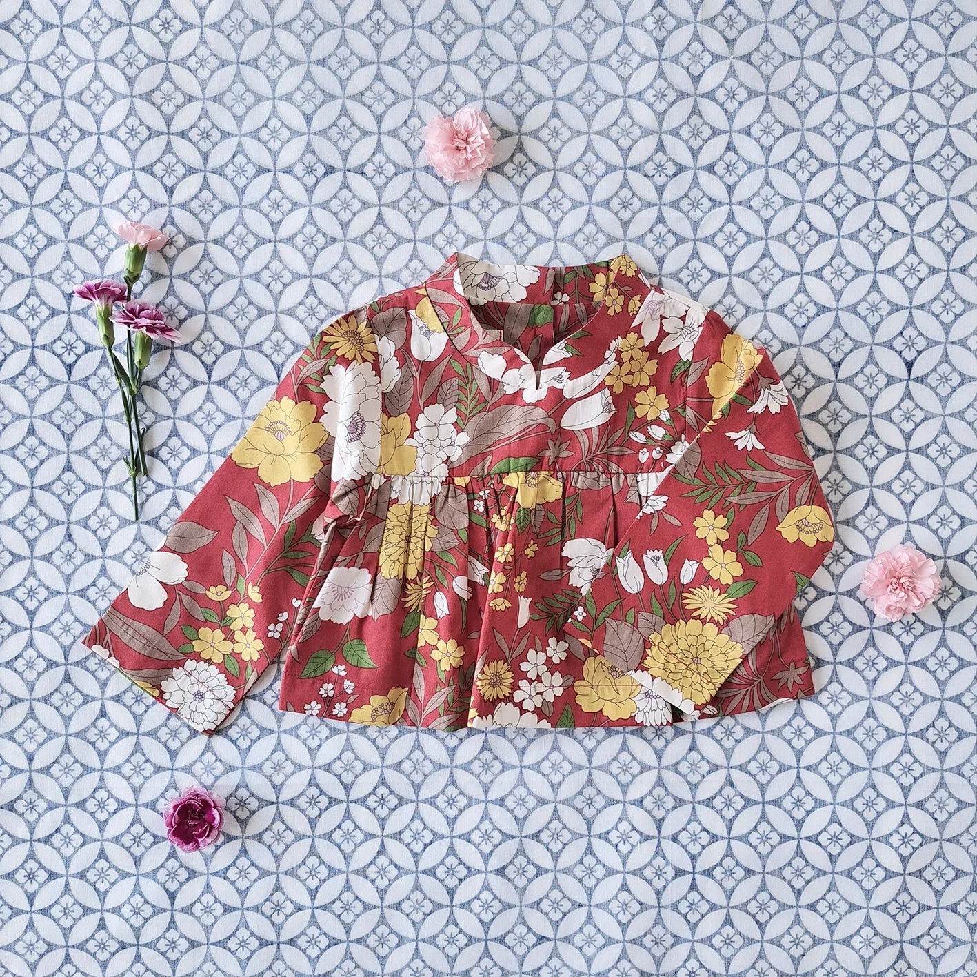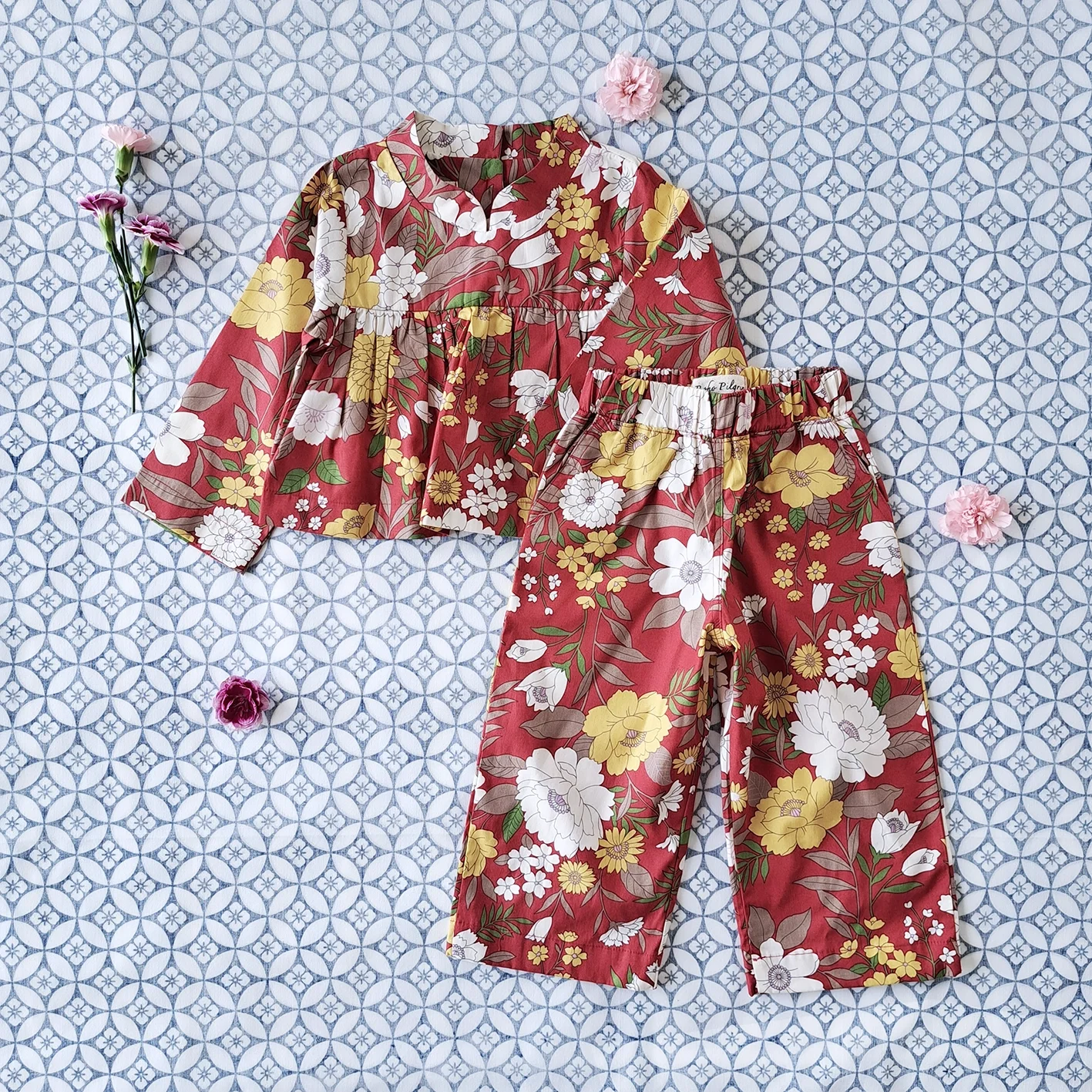 แพ๊ก 2 ชิ้น เด็กหญิง เสื้อ+ กางเกงขายาวเอวยางยืด มีกระเป๋าล้วงข้าง 100% คอตตอน ผ้าพิมพ์ลายไม้นำโชคสีแดง *สินค้าสั่งจองล่วงหน้า ส่งสินค้าออก 7 ธันวาคม