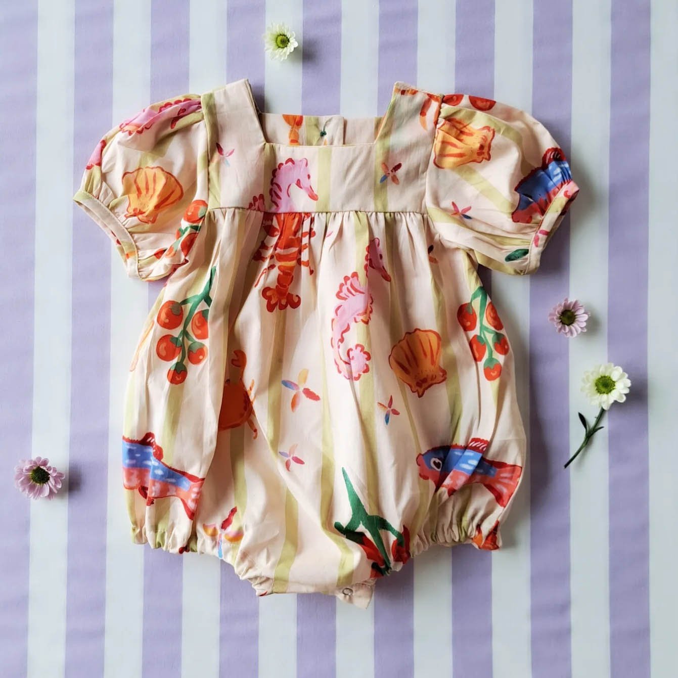 ชุดรอมเปอร์เปิดเป้าเปลี่ยนผ้าออ้อมได้ แขนพอง กระดุมหลัง 100% ผ้าคอตตอนพิมพ์ลายทะเลหน้าร้อน *สินค้าสั่งจองล่วงหน้า ส่งสินค้าออก 13 มีนาคม